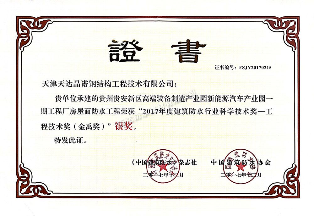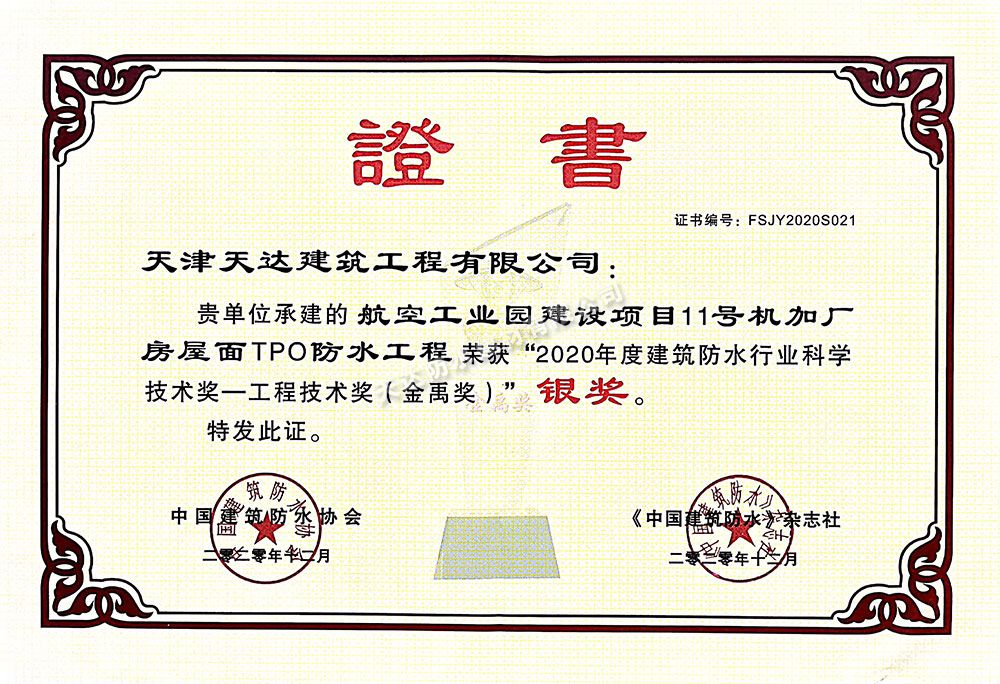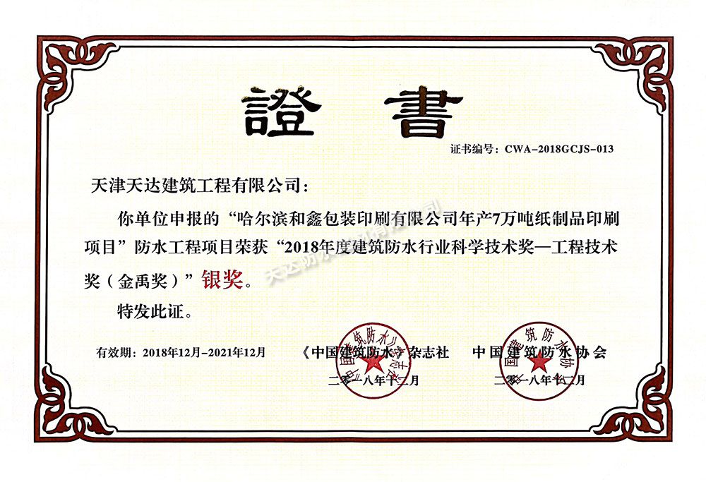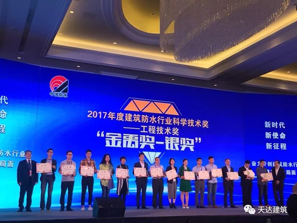 • 見(jiàn)證輝煌丨天達(dá)防水榮獲“2018年度建筑防水行業(yè)科學(xué)技術(shù)獎(jiǎng)-工程技術(shù)獎(jiǎng)(金禹獎(jiǎng))”