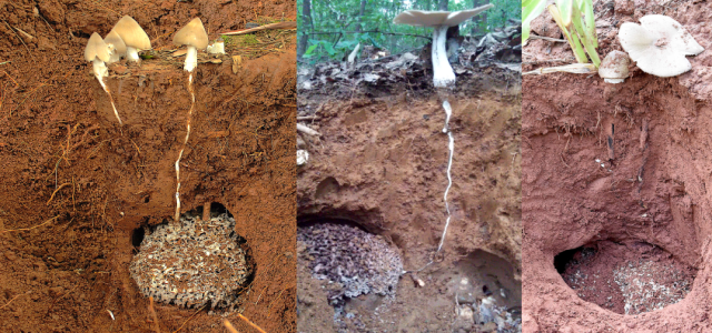 如果白蟻巢體上培養(yǎng)的是雞樅菌的菌絲體,當(dāng)春天來臨、雷雨過后,蟻巢上方的土壤含水量增大,形成適當(dāng)?shù)臏夭睢癫?、氣壓差,巢體上就會形成原基,原基長高形成假根,假根穿過巢體上方的空間,進入巢體上方的土壤,土壤中含水量適宜,假根很快長出土面形成菌柄,菌柄頂端形成菌蓋。雨后空氣濕度大,適合菌柄和菌蓋的生長,在土面上就會突然長出大量雞樅菌的子實體。每年的5月至10月,只要我們不破壞蟻巢,不擾動、驚嚇白蟻,一個蟻巢可以連續(xù)出菇4至5批次。營養(yǎng)豐富的雞樅菌子實體為地面上的昆蟲以及人類提供了美味的食物。在一個很小的干重不到100克的蟻巢體上,就可采集到500克以上的鮮菇,這個出菇行為會大量消耗白蟻所需要的營養(yǎng)物質(zhì)。